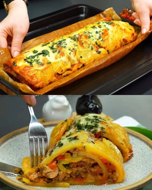 This Baked Rolled Potato and Meat Casserole is a showstopping main dish that combines the heartiness of layered potatoes with the bold flavors of spiced minced meat and melted mozzarella. It’s comfort food with flair—perfect for family dinners, weekend gatherings, or holiday tables. Thinly sliced potatoes form the base, baked until tender and golden, then rolled with a savory meat and pepper filling, topped with cheese, and baked to perfection. The result is a golden, cheesy roll that slices beautifully and delivers bold flavor in every bite.
