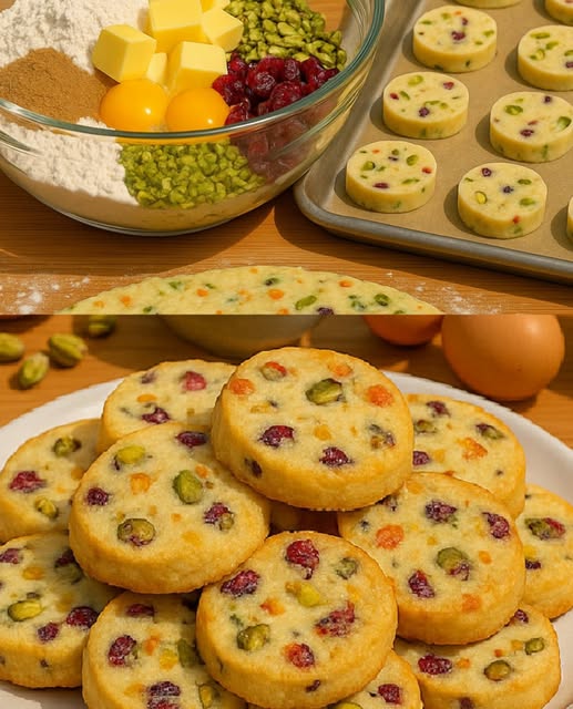 - Gently stir in dried cranberries and chopped pistachios.