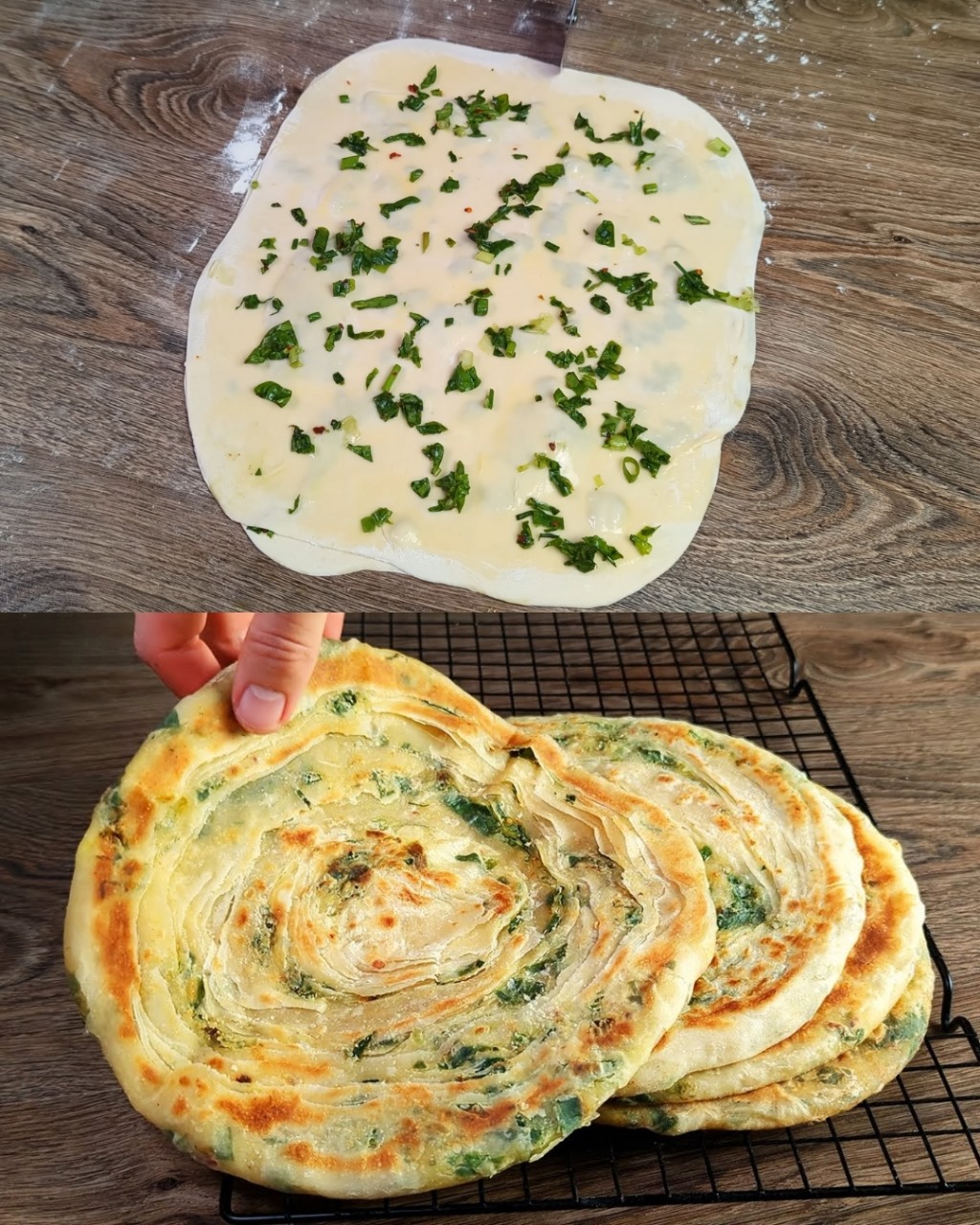 This Layered Flatbread is soft, flaky, and filled with a delicious combination of spinach and green onions. It’s a simple recipe that doesn’t require yeast or an oven—just a skillet and some basic ingredients. Perfect for breakfast or as a snack, this flatbread is a must-try!