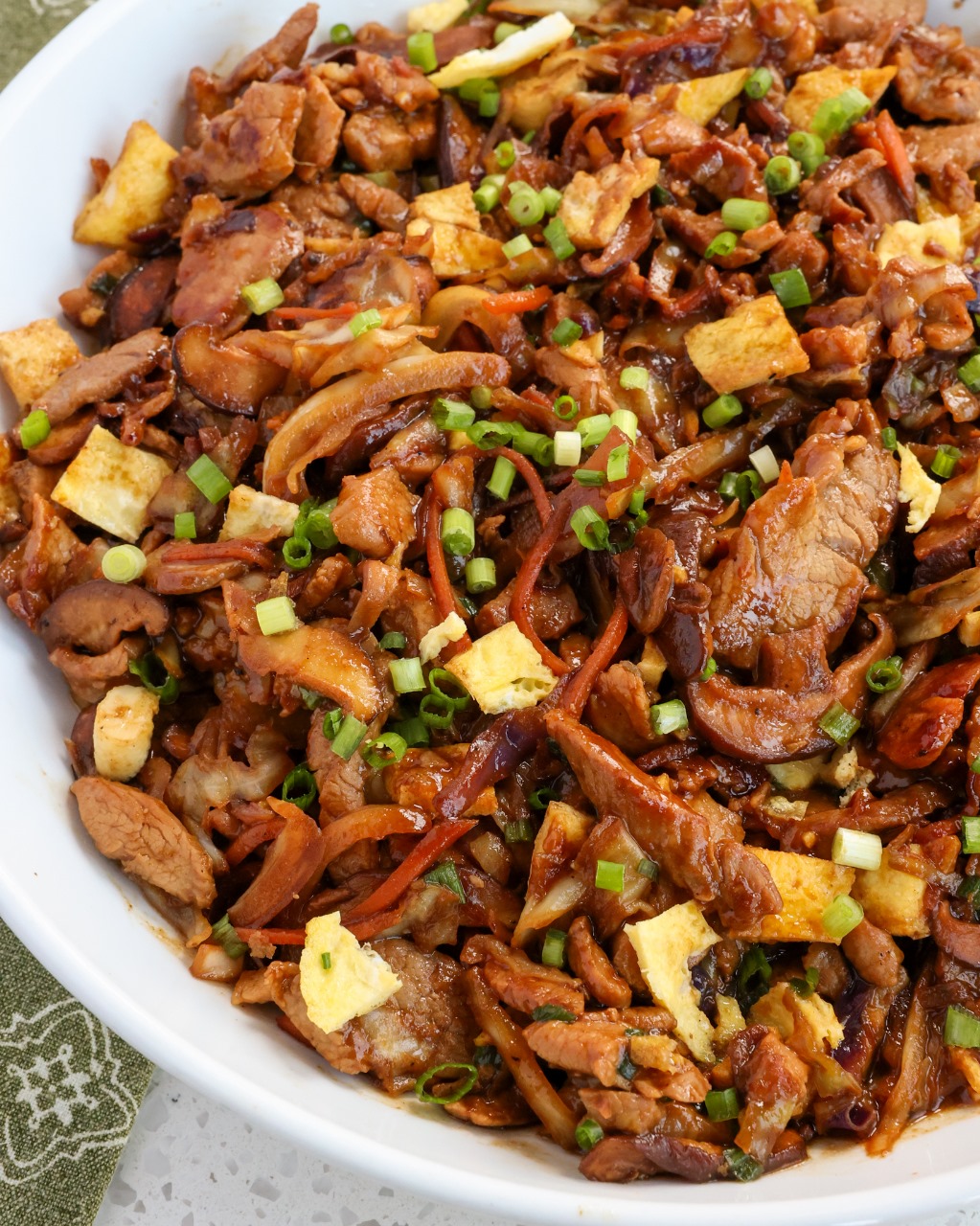 Moo Shu Pork combines thin slices of marinated pork combined with veggies, eggs, and green onions in an easy savory sauce made with Hoisin, garlic, ginger, and black pepper.